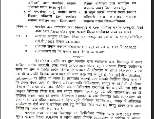यह पूरा मामला उच्च न्यायालय बिलासपुर के निर्देशों से जुड़ा है, जिसमें आदेशित किया गया था कि संजय कुमार मरकाम बनाम छत्तीसगढ़ शासन मामले में संलग्न अधिकारियों की दिव्यांगता की स्थिति स्पष्ट करने के लिए जांच आवश्यक है।