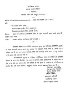 आवेदक संतोष कुमार टोंडे ने 6 अक्टूबर 2025 को सूचना के अधिकार अधिनियम, 2005 के तहत दिव्यांगों की छह सूत्रीय मांगों पर विभाग द्वारा की गई कार्रवाई की जानकारी मांगते हुए आवेदन प्रस्तुत किया था। सभी आवेदनों के साथ नियमानुसार 10 रुपये का शुल्क जमा कर विधिवत पावती प्राप्त की गई, लेकिन विभाग ने अपने जवाब में यह कहकर सभी आवेदन निरस्त कर दिया कि शुल्क संलग्न नहीं था।