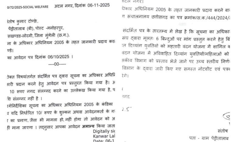 रायपुर। राज्य के दिव्यांगजन समाज की न्यायिक और प्रशासनिक उपेक्षा एक बार फिर उजागर हुई है। समाज कल्याण विभाग, मंत्रालय महानदी भवन नवा रायपुर में लगाए गए सूचना के अधिकार के आवेदन को विभाग ने मनमाने ढंग से अमान्य घोषित कर दिया है।
