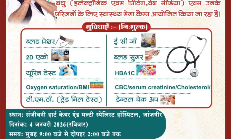 जांजगीर-चांपा। पत्रकार साथियों एवं उनके परिजनों के स्वास्थ्य संरक्षण को ध्यान में रखते हुए संजीवनी हार्ट केयर एंड मल्टी स्पेशलिस्ट हॉस्पिटल, जांजगीर की ओर से 4 जनवरी 2026, रविवार को एक निःशुल्क मेगा हेल्थ चेकअप कैंप का आयोजन किया जा रहा है। यह विशेष स्वास्थ्य शिविर डॉ. गौरीशंकर कश्यप की स्मृति में आयोजित किया जा रहा है, जिसमें जिले के समस्त पत्रकार बंधु इलेक्ट्रॉनिक, प्रिंट एवं वेब मीडिया तथा उनके परिजनों को आमंत्रित किया गया है।